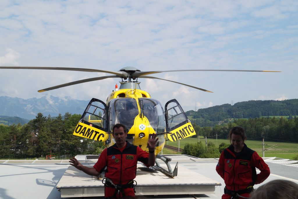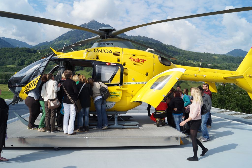 Der diensthabende Pilot, der Flugretter und die Notärztin empfingen die Gruppe und gaben einige Informationen zu der Entstehung und den Aufgaben der Flugrettung in Vorarlberg. Es folgten ein Rundgang durch die Räumlichkeiten sowie die Besichtigung eines Eurocopter 135. Dieser verfügt über zwei Turbinen und ist daher derzeit eines der sichersten Fluggeräte.